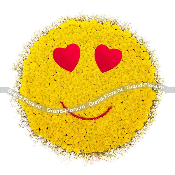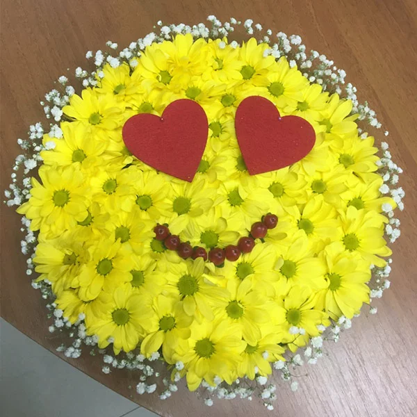 Прекрасная композиция на «оазисе» выполненная из кустовой хризантемы и декоративных сердец и стилизованная в виде смайлика. Идеальный «оригинальный» подарок на День Валентина.