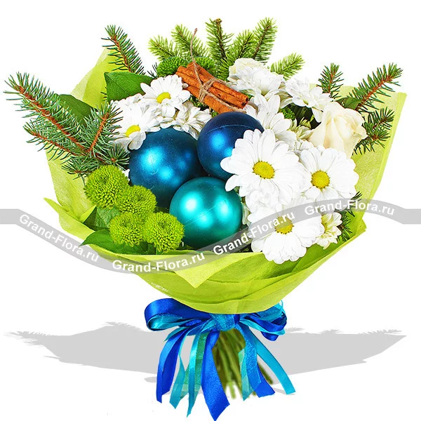 Стандартный (на фото): хризантема белая - 3шт., роза белая - 2шт., хризантема зеленая (сантини) - 2шт., еловая ветвь, корица, новогодний декор и зелень, фетр.