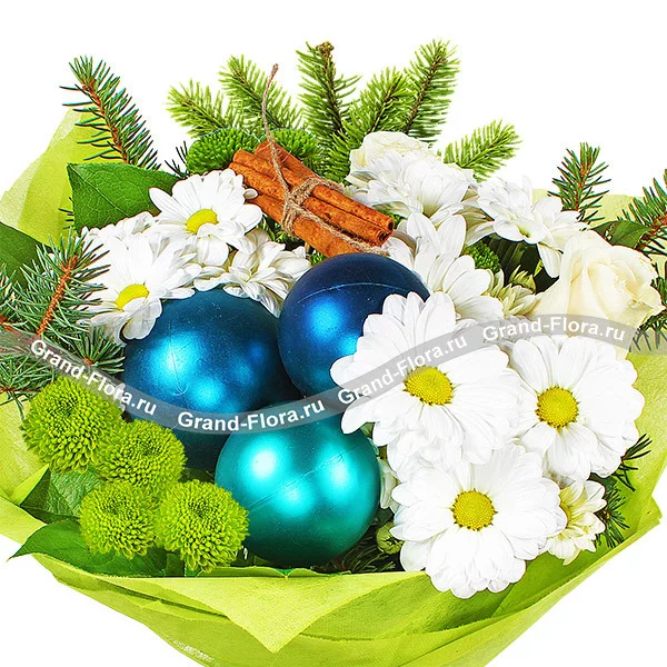 Уменьшенный: хризантема белая - 2шт., роза белая - 1шт., хризантема зеленая (сантини) - 1шт., еловая ветвь, корица, новогодний декор и зелень, фетр.