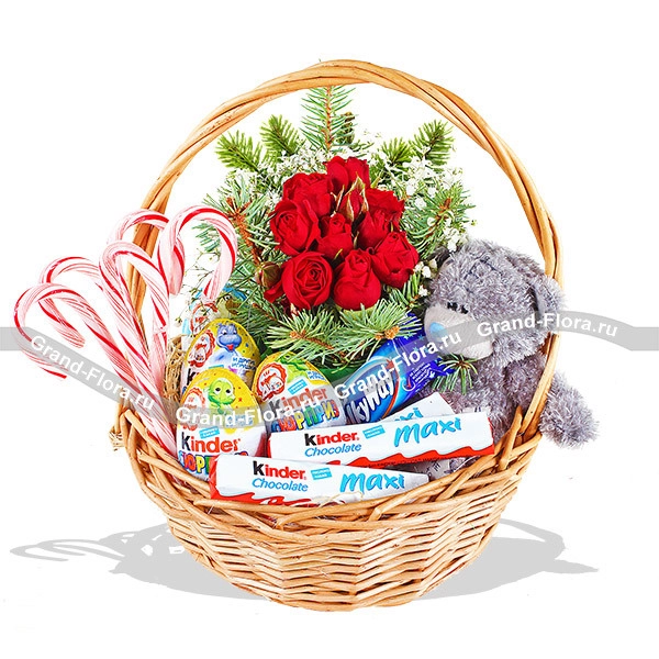 Уменьшенный: роза красная кустовая - 1 шт., гипсофила - 1 шт., еловая ветвь, Мишка Teddy - 20 см, рождественские конфетки - 5 шт., Kinder Сюрприз - 3 шт., Kinder Chocolatе max - 3 шт., MilkaWay - 1 шт., оазис, корзина малая.