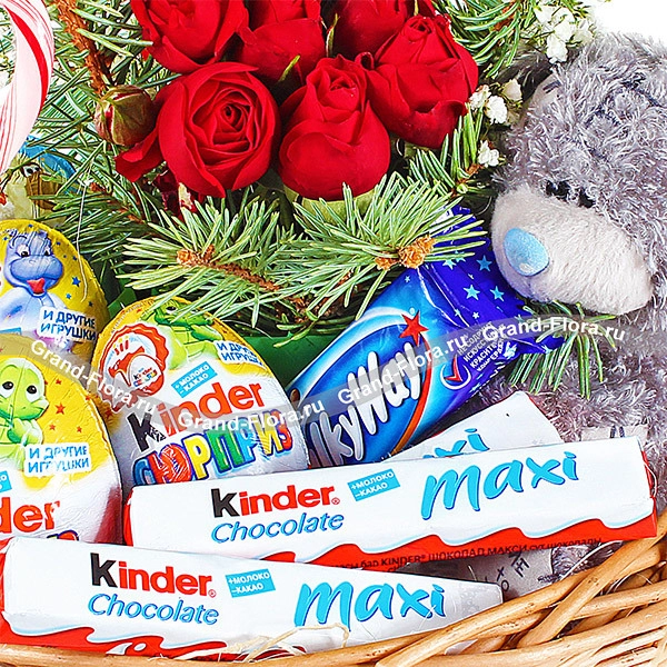 ДЕЛЮКС: роза красная кустовая - 5 шт., гипсофила - 5 шт., еловая ветвь, Мишка Teddy - 20 см., рождественские конфетки - 13 шт., Kinder Сюрприз - 11 шт., Kinder Chocolat max - 11 шт., MilkaWay - 3 шт., оазис, корзина большая.