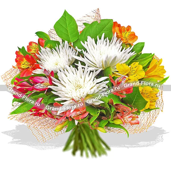 Стандартный: хризантема белая игольчатая - 5 шт., альстромерия желтая - 1 шт., альстромерия оранжевая - 1 шт., альстромерия розовая - 2 шт., альстромерия малиновая - 2 шт., декоративная зелень, сетка розовая.