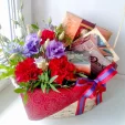 ДЕЛЮКС: шоколад "DOVE" - 2 шт., чай "Greenfield" - 1 шт., конфеты "Ferrero Rocher" - 1 шт., эустома - 4 шт., гвоздика - 5 шт., декоративная зелень, оазис, корзина малая, красно-фиолетовый бант, фетр.