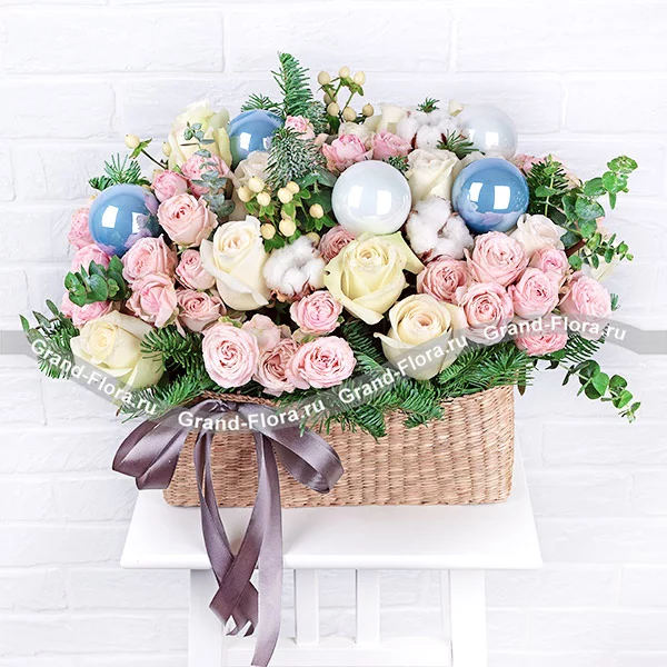 Стандартный: роза кустовая розовая - 8 шт., роза белая - 9 шт., гиперикум белый - 3 шт., хлопок - 4 шт., эвкалипт, ель, шарики - 5 шт., оазис, корзина средняя.